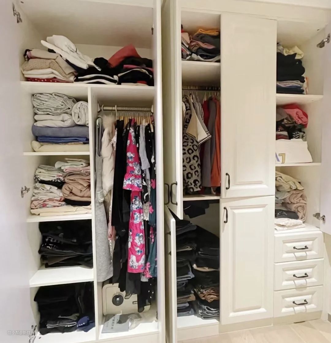 大部分做了叠衣格子之后的衣柜内,是如图这个光景。而且,就这,还是精细一点的人,取衣服之后,要整理一下的。