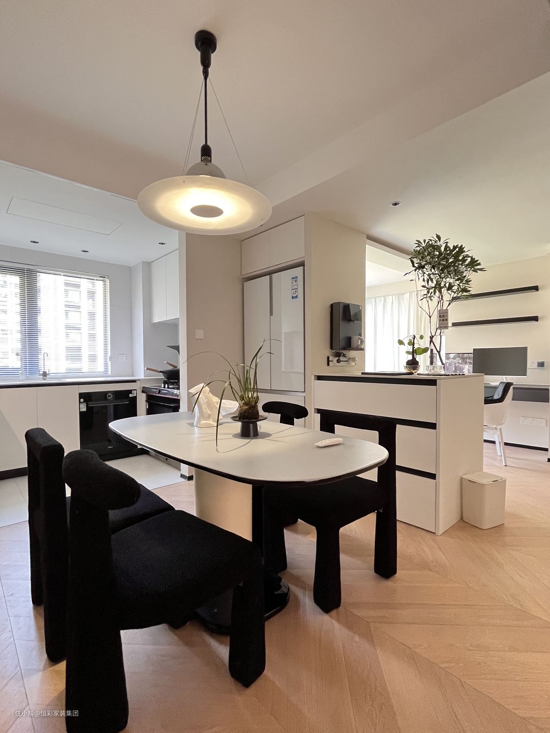餐厅灯是FLOS设计师款飞碟吊灯,通体纯黑的网红餐椅抓人眼球,舒适感爆棚。