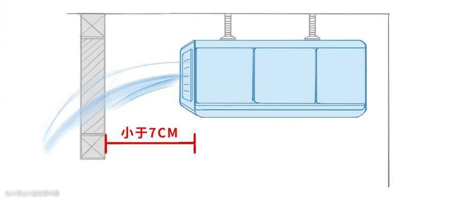 空调出风口与吊顶完成面的距离,不能离得过远,因此整个空调的进深应该和吊顶的深度相匹配。一旦距离太远,冷气/暖气很难吹出吊顶,效果无法保证。建议空调出风口和吊顶完成面的距离不宜超过7厘米。