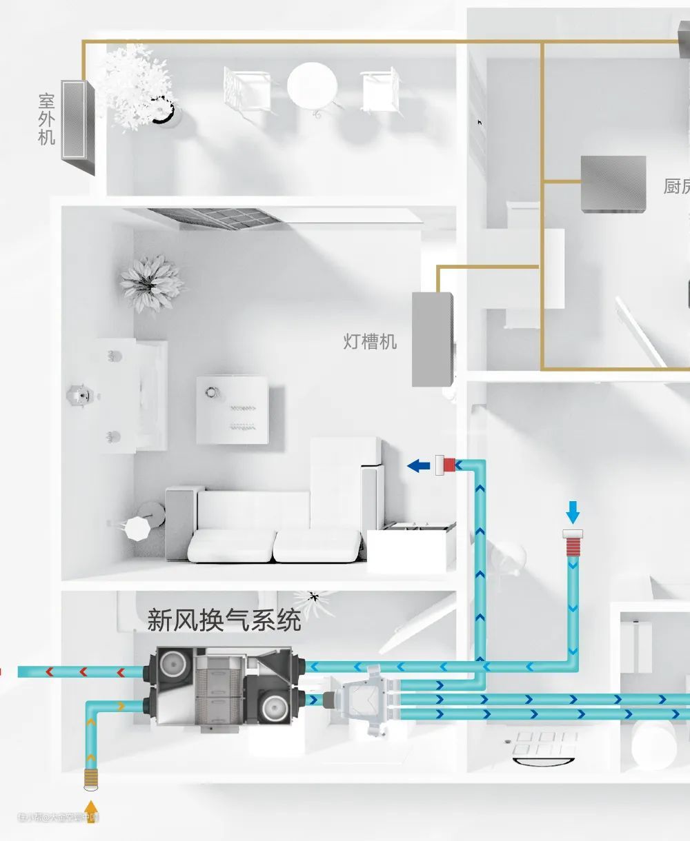新风引入口和废气排出口建议放在房间的对角线上,让房间有完整的新风回路,空气最大范围地流通。