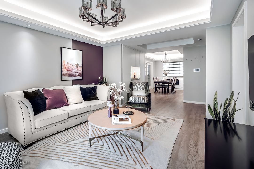 在客厅,设计融合了对美式与现代的梳理与吸纳。简单的灰、紫撞色拼接的背景墙,米白色约瑟美学的三人位沙发,内部是实木框架,面层是进口布艺再搭配边角精致的铆钉装饰,让空间自然而然地生发出了经典美式的质感。