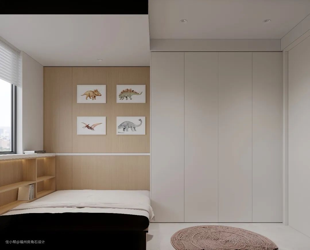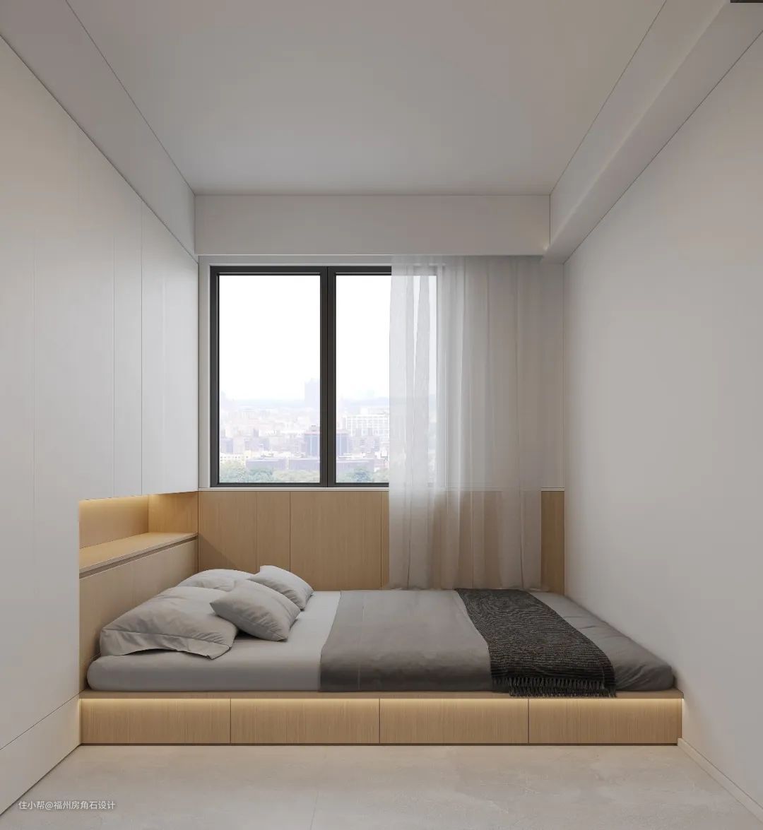 The bedroom space is harmonious in color, and the atmosphere is comfortable and natural. The linear light on the wall has rich layers, and the side cabinet on one side of the bedside adds design highlights.