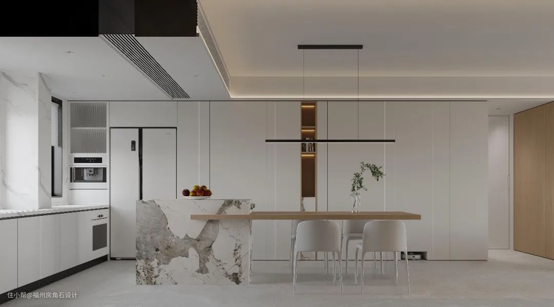 The highlight of the restaurant is the design of the island platform in the rock slab. The table above the island platform can be integrated with the table for temporary placement. When relatives and friends come to visit, the table top will not appear crowded, and the dining environment experience will be improved.