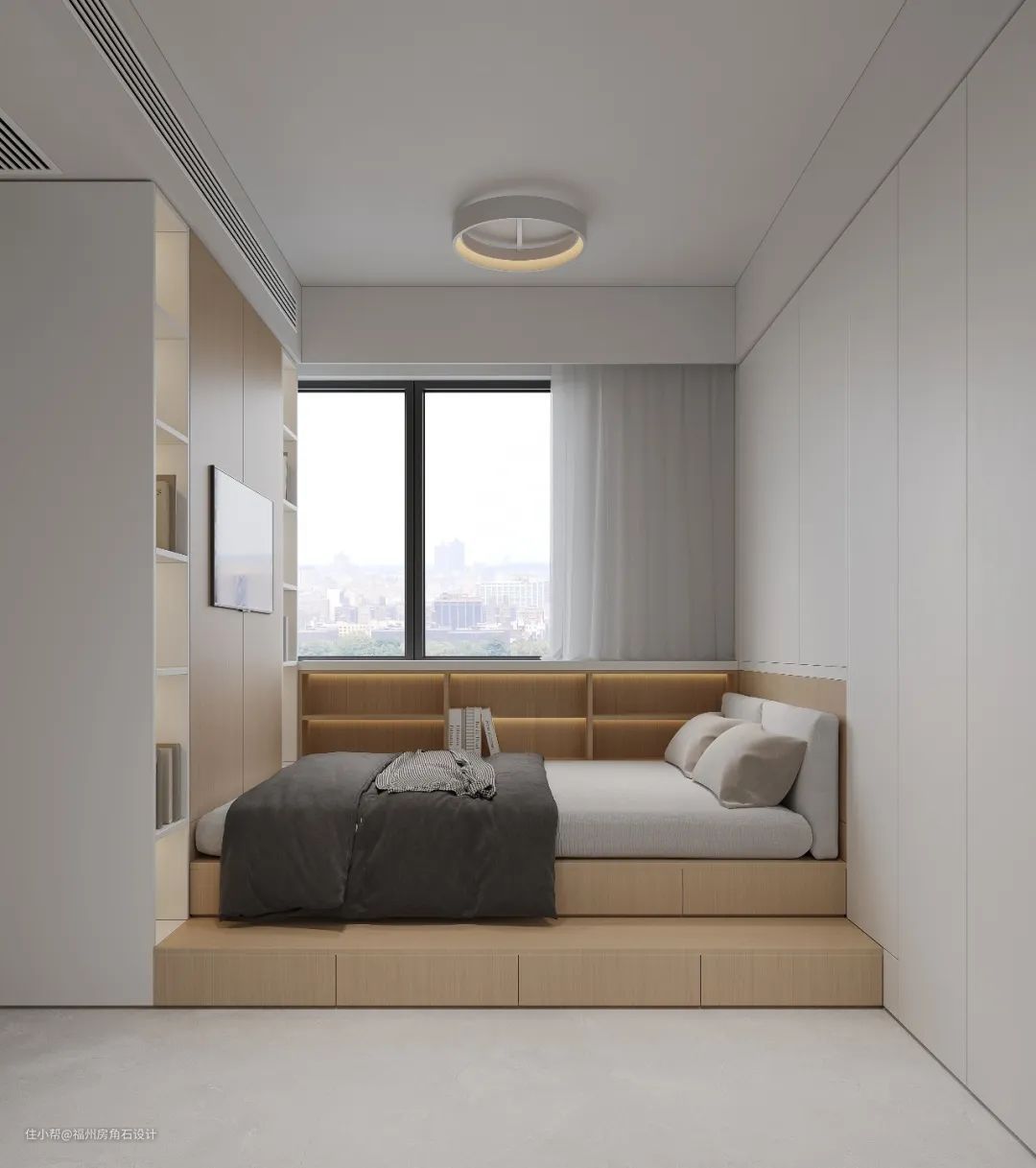 卧室空间设计选择温馨浪漫的家具让空间变得柔和。储物柜的设计让收纳空间更加充足。窗帘拉开的自然光线进入房间,营造一种质朴,温馨的设计美感。