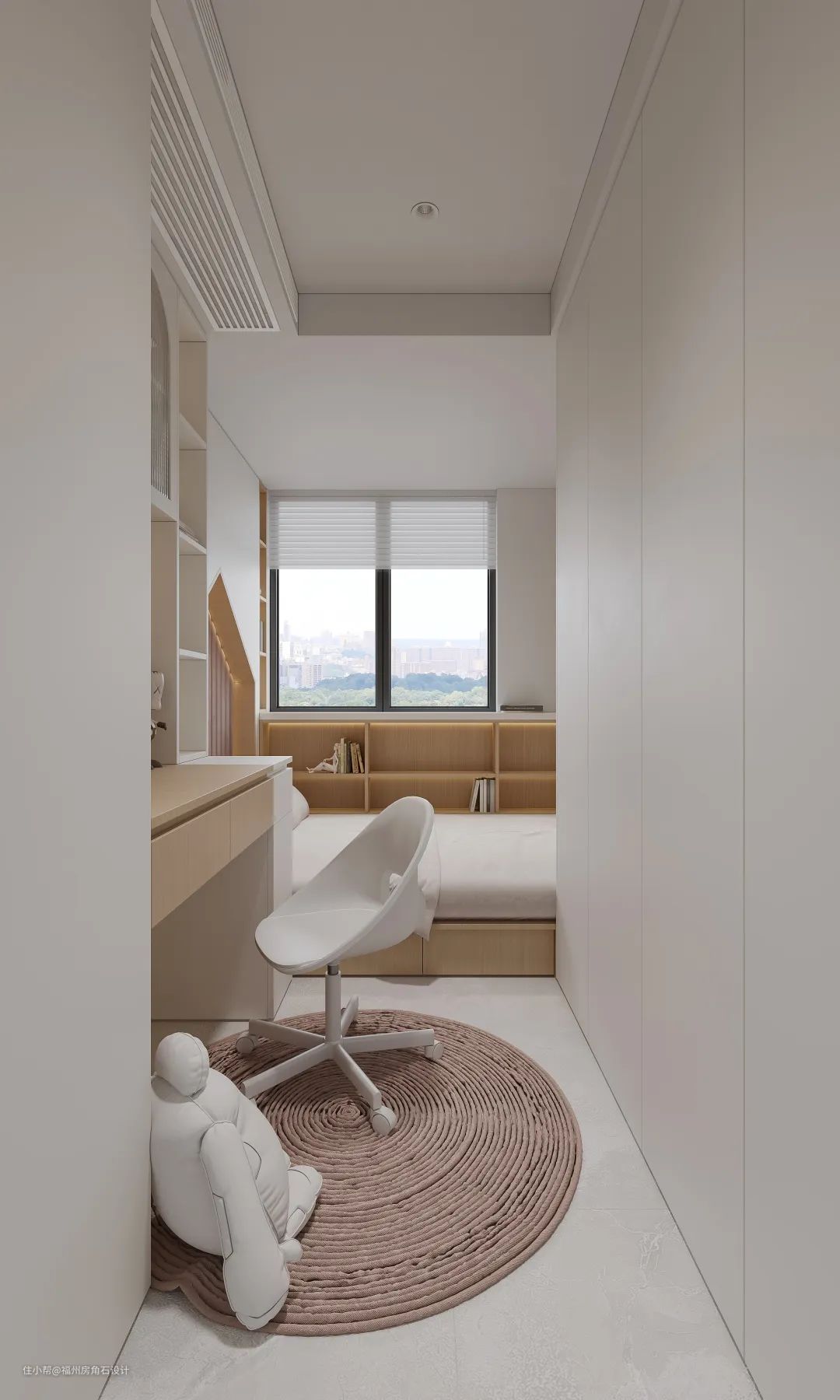 The bedroom space design chooses warm and romantic furniture to make the space soft. The design of lockers allows more storage space. The natural light from the curtain opening enters the room, creating a simple and warm design aesthetic feeling.