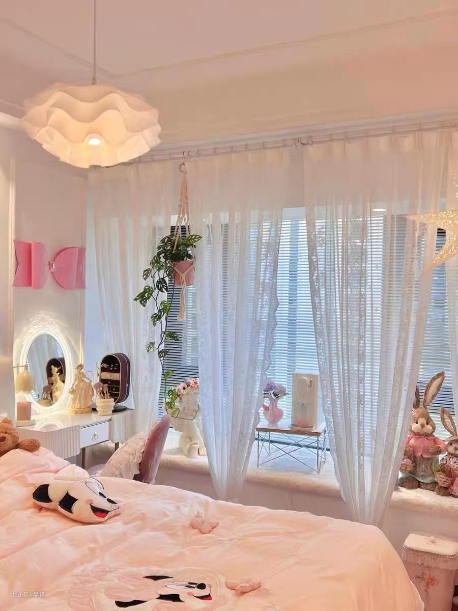 卧室选择了软糯毛绒地毯,白色蕾丝窗帘,软萌玩偶摆件,粉嫩床品等软装搭配,营造整体空间的浪漫温馨氛围。