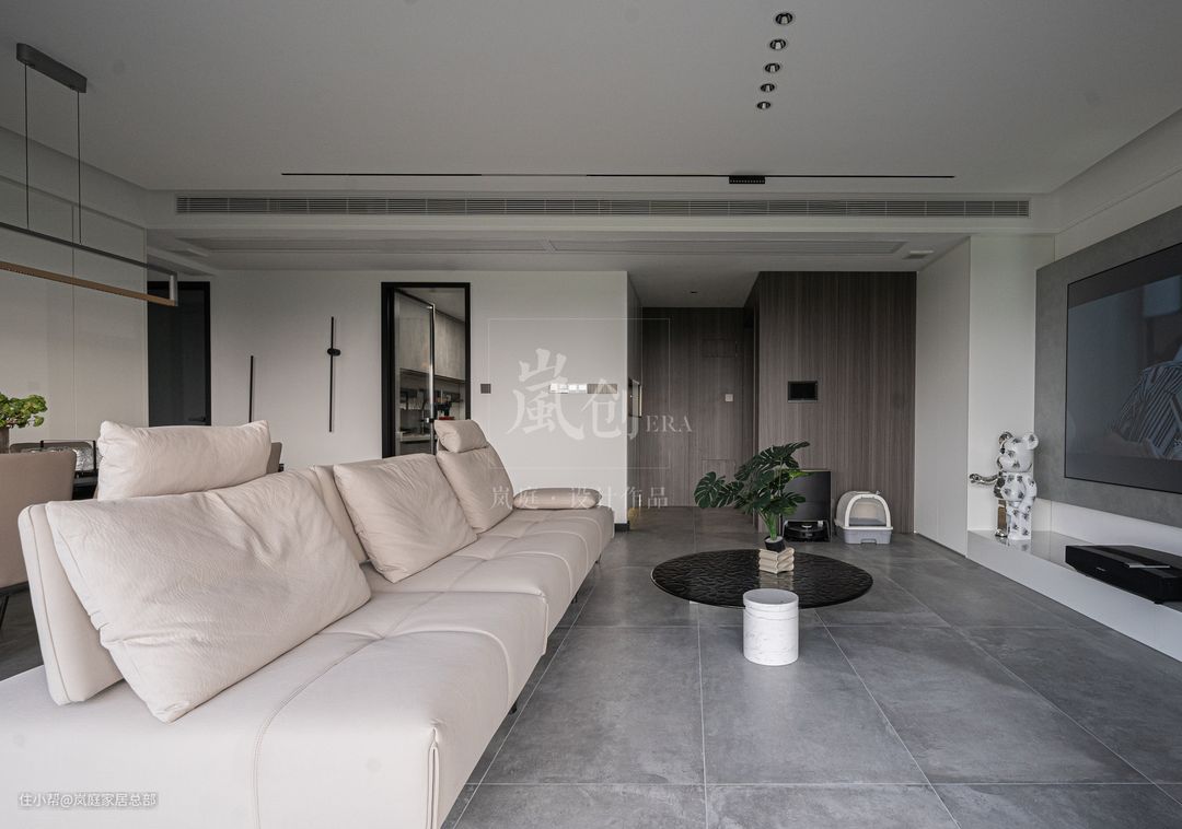 灯光:客厅灯光采用磁吸轨道灯和筒灯组合设计,吊顶四周暗藏灯带设计,暖黄色灯光更具温馨感。虽然是无主灯设计,但是在氛围感方面还是尽量保证了空间的温馨惬意感。电视背景上下留空,做灯带设计,一家人静享居家时光。 地砖:选择深灰色的哑光地砖铺贴,750*1500的大尺寸地砖,能更好地彰显空间的高级感。哑光材质更耐脏,配色上也是贴合整屋空间的极简风。