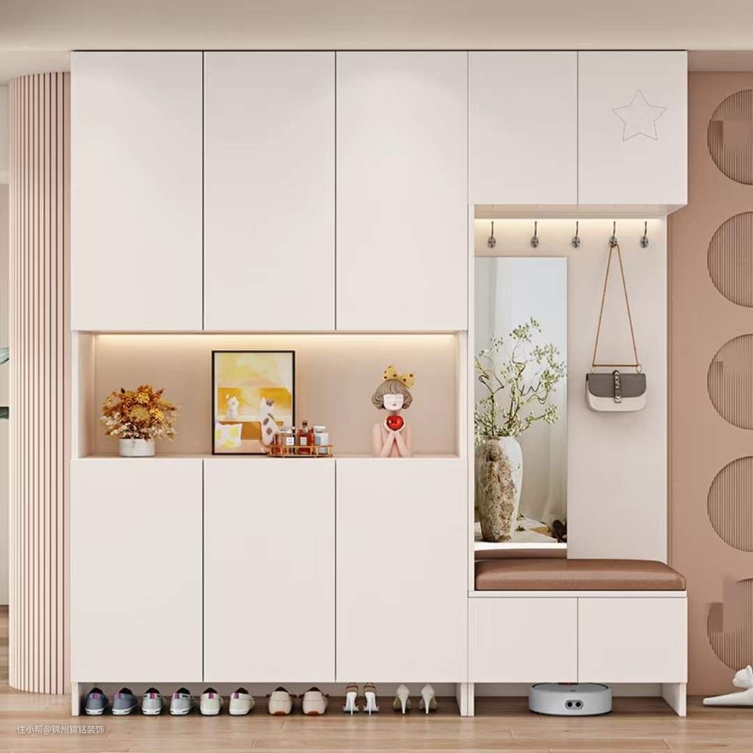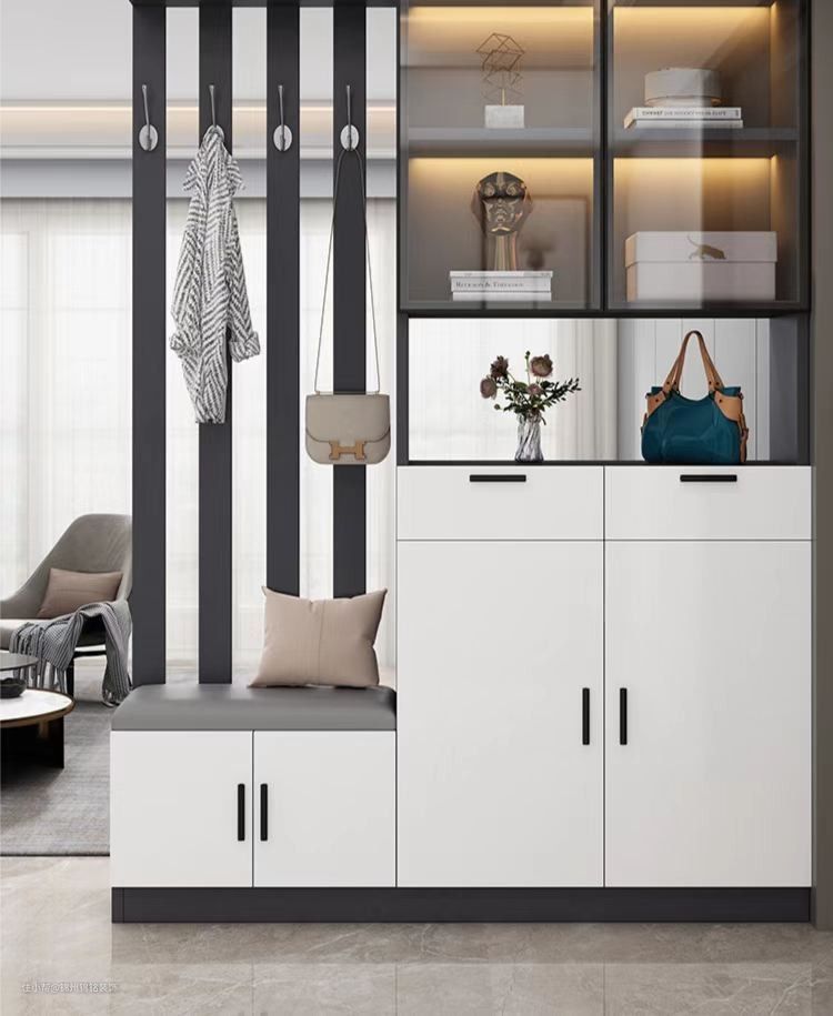 鞋柜门不要再做拉手,入户处空间本身就拥挤,经常会刮到衣服,如果有小朋友经过时,还容易磕碰到,不安全。建议选择隐藏式的鞋柜门,美观还安全。