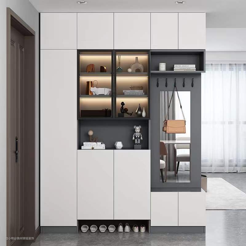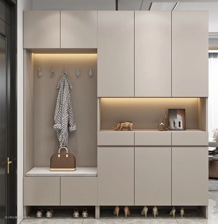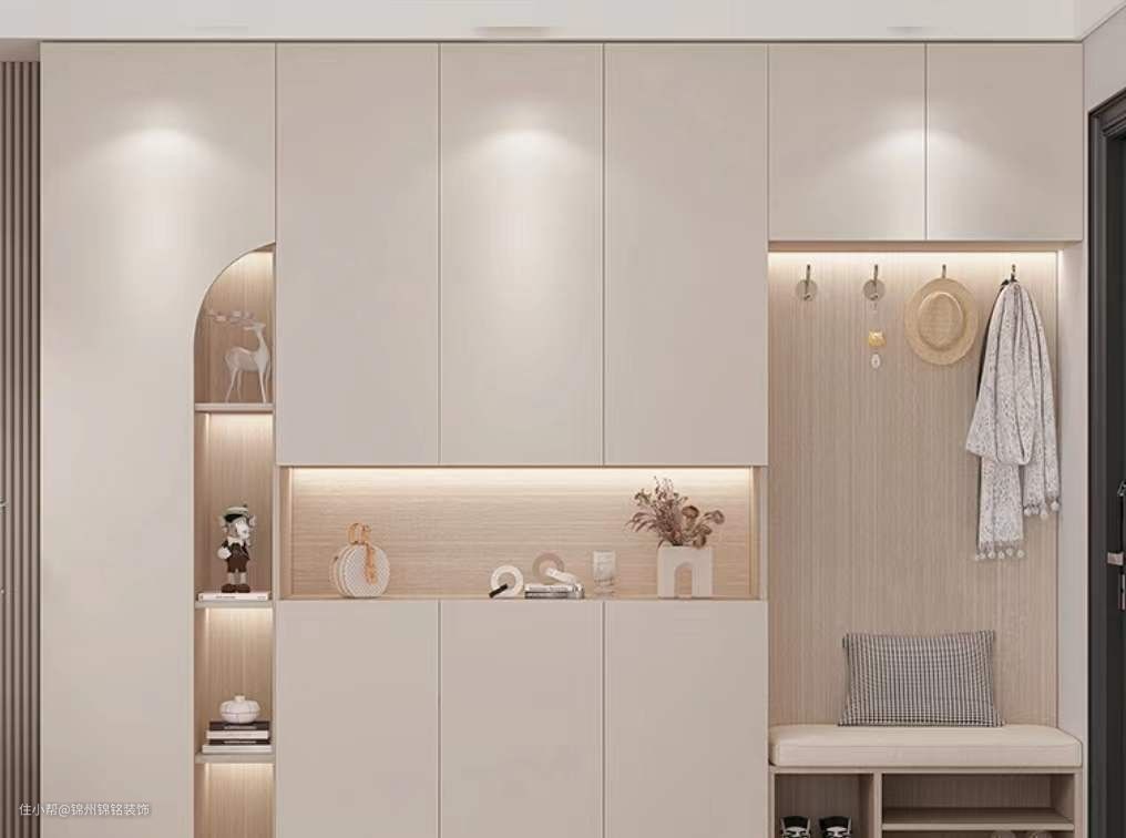 千万不要把柜体和柜门做成异色,统一的颜色才够好看。建议选择浅色,入户处本身采光就比较差,如果选深色看起来会很压抑,浅色才自然舒适。也可以在玄关柜嵌入灯带,增加温馨的氛围感,但需要在改水电时提前预留电源位置。