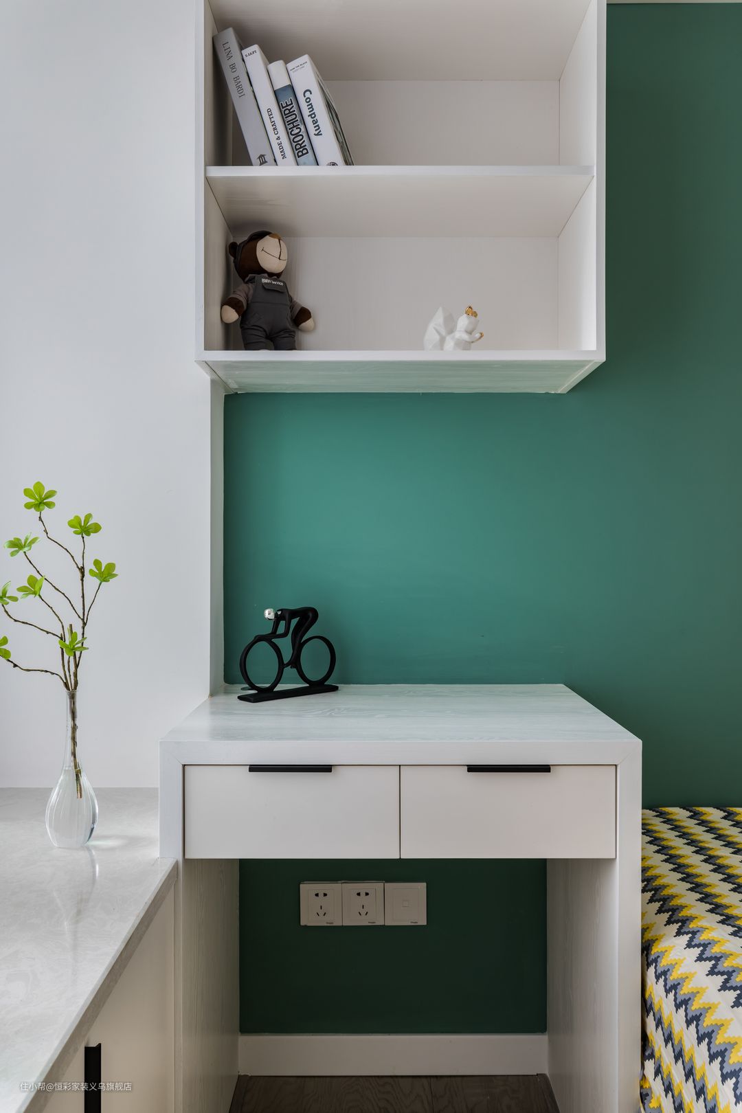 儿童房以绿、白的配色,简洁大气,新增的飘窗让房间更明朗,配上纱帘完全不影响采光隐私性佳。下置双开门柜,储物功能up。软装方面,不论是小黄鸭或是史迪仔都充满了童趣感,符合孩子的喜好。
