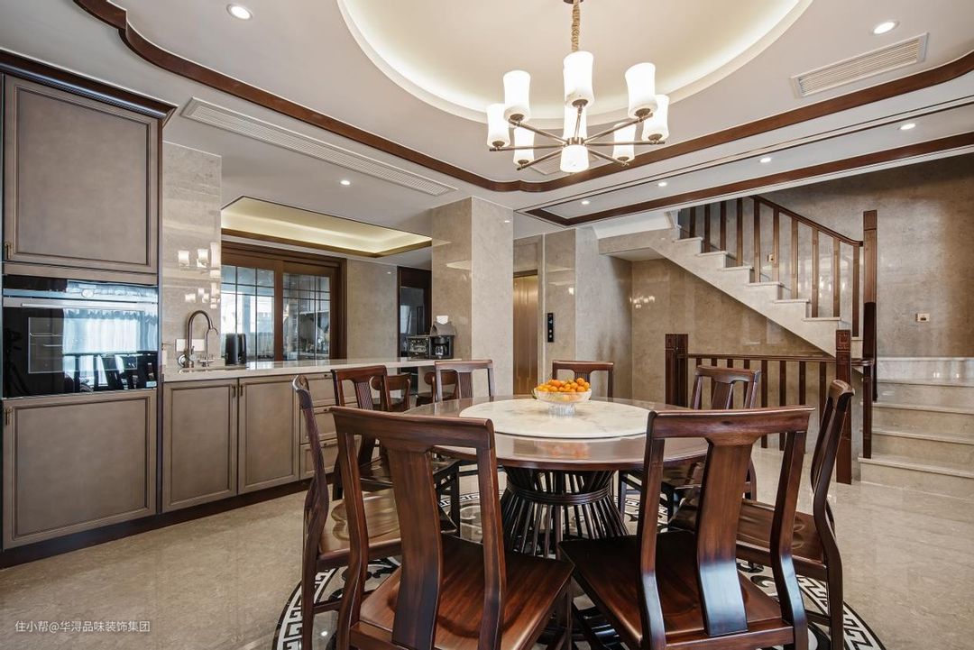餐厅吊顶四角内凹,造型取自传统中式的如意,寓意吉祥;而吊顶和餐桌以及地面都做了圆形的造型,寓意一家人团团圆圆的。