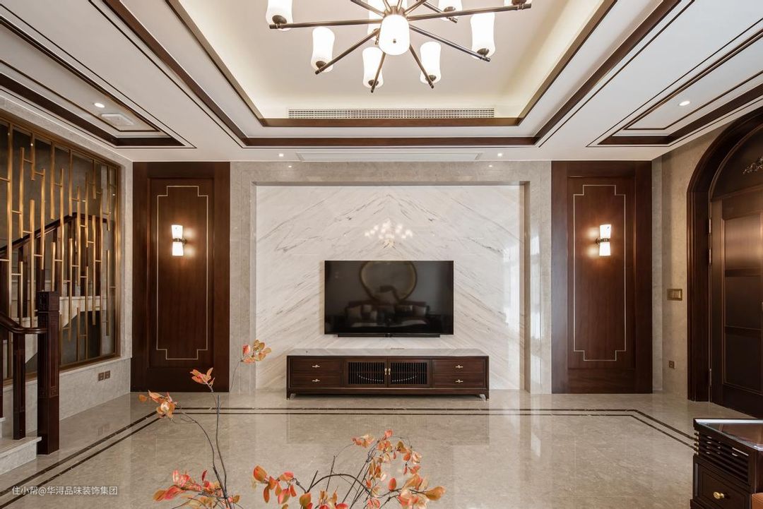 电视背景墙设计的相对简洁,白色大理石墙体和两侧红棕色护墙板搭配在一起,显得端庄、稳重;左侧用金属材质的镂空隔断,从细节中透露出奢华的气息。