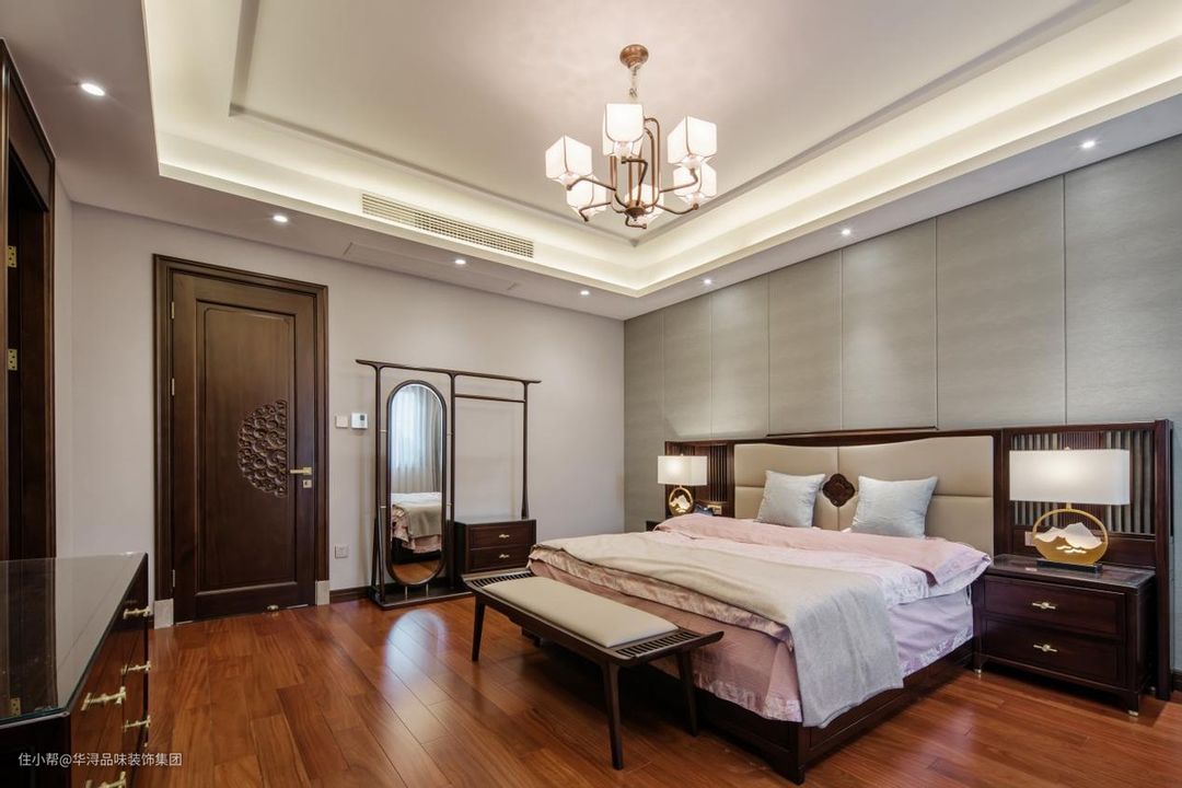 温馨舒适就是对主卧最好的诠释,香槟色床品和软装刚好中和掉红棕色木地板的沉闷,吊灯则为整个空间注入优雅轻奢的气质。