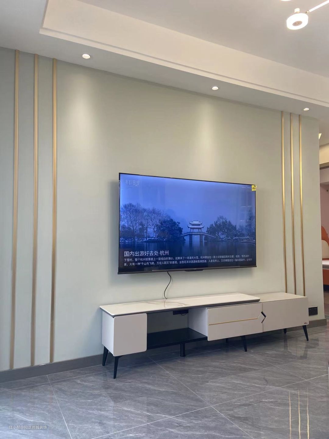 首先电视背景墙采用乳胶漆的淡色跳色,加上一点点的金色线条的点缀,简约大气。