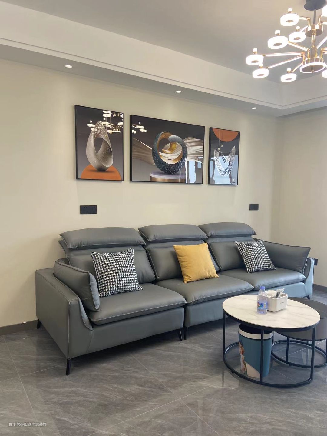 客厅全屋都是淡色油漆,沙发和挂画配色,简单大气,有质感。