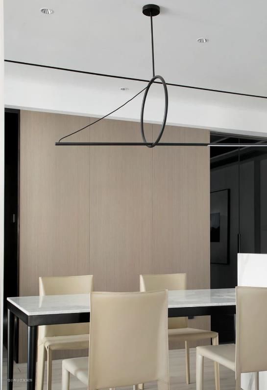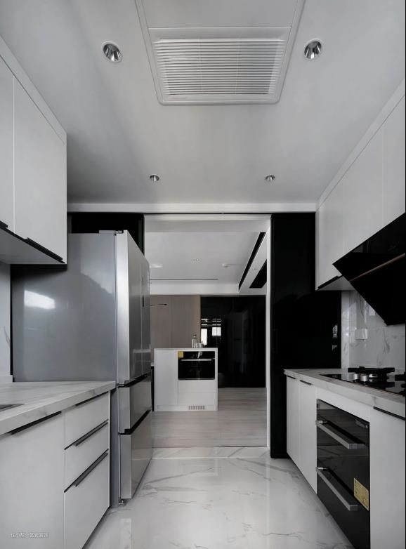 厨房考虑到户型结构的问题,设计师利用了极窄边框移门更大化的利用了厨房的空间,暗藏式移门,可敞开可封闭,两个空间既共生又独立。
