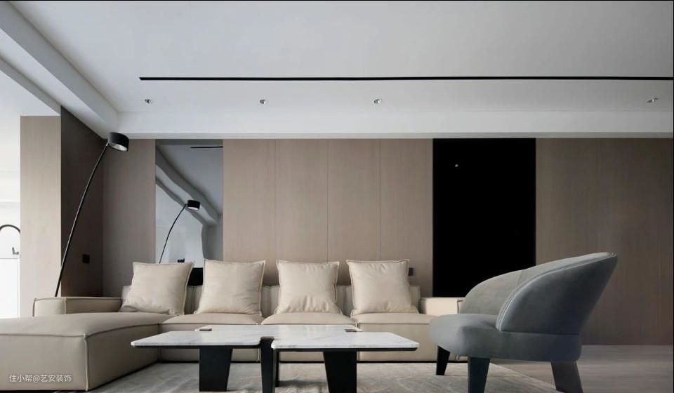 采用米白色的L型沙发,搭配黑色长杆线条落地灯,点亮低调品质生活。
