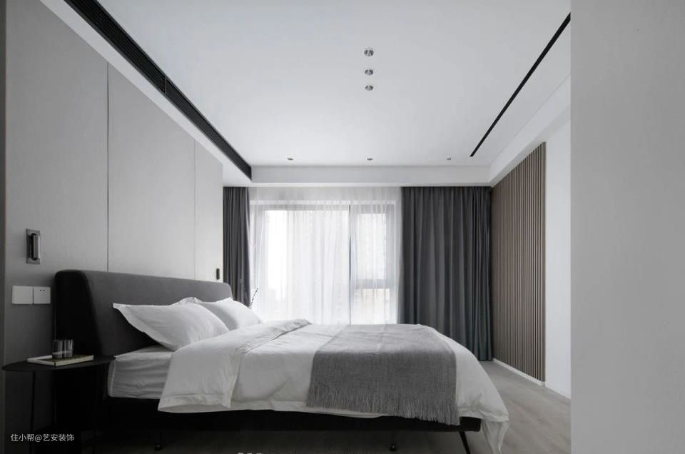 卧室以高级灰色调为主调,浅灰色的木饰面搭配深灰色的床,在深浅的变化之中体现空间的层次感,沉静理性色调给人的休憩提供了安静的环境。