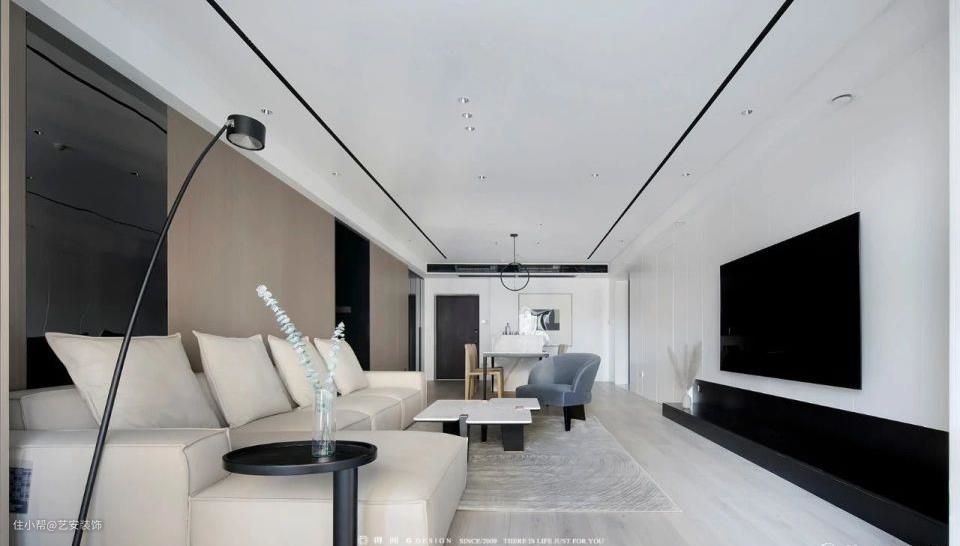 客厅开放的布局,造型干净利落的顶面和墙面,体现了现代简约生活的品质感。