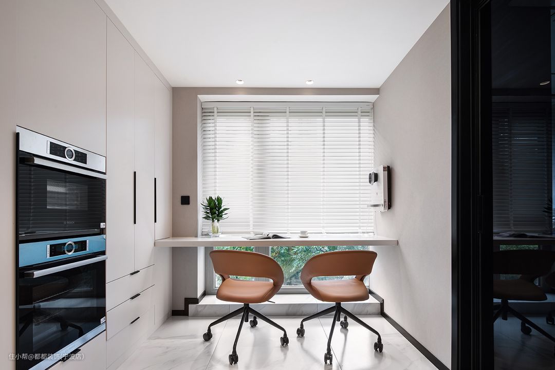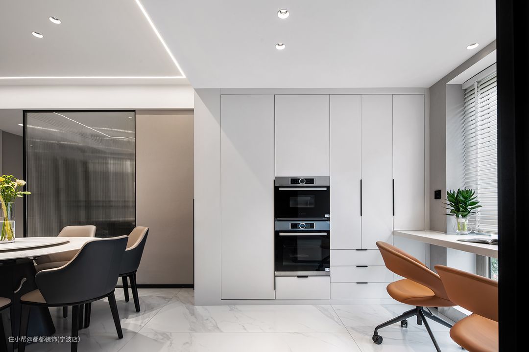 开放式西厨位于靠窗处,拒绝切割空间,家里更显通透敞亮,西厨区还设计了餐边柜和操作台,左侧做一门到顶的立柜,内嵌烤箱和蒸箱!作为咖啡控、甜点党的闻小姐超爱~