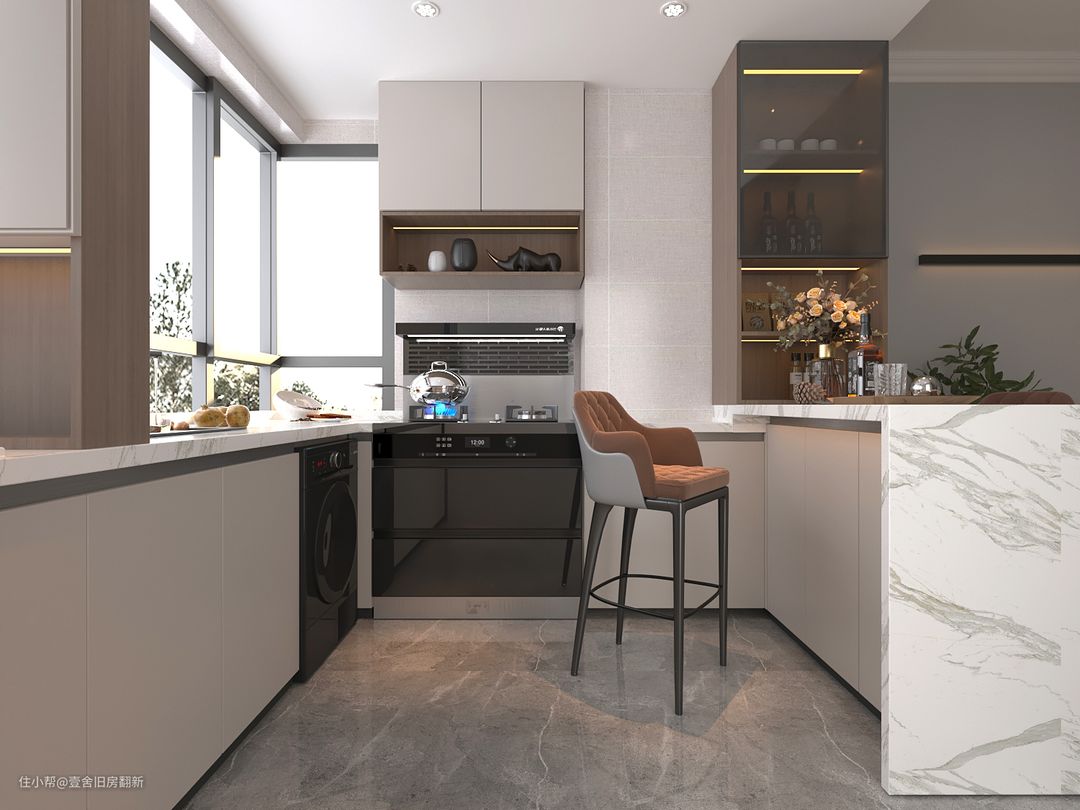 开放式厨房可不是只有大平层才可以实现,小户型开放式厨房更加别具一格,蒸烤箱、洗碗机、家电必不可少。