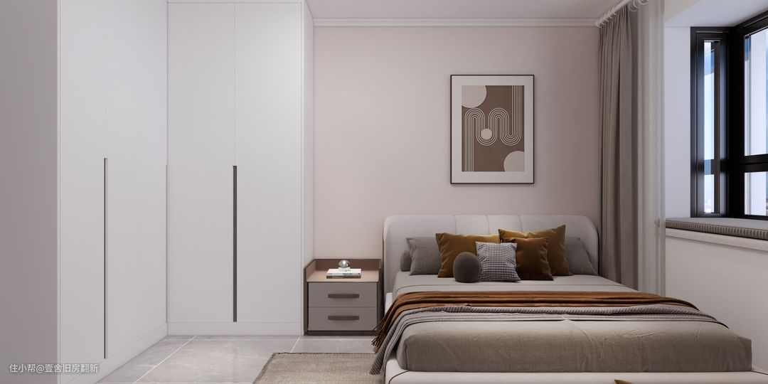 卧室23平方左右,设计转角衣柜,咖色系里增加深色系的软装,房屋颜值瞬间提升了不少。