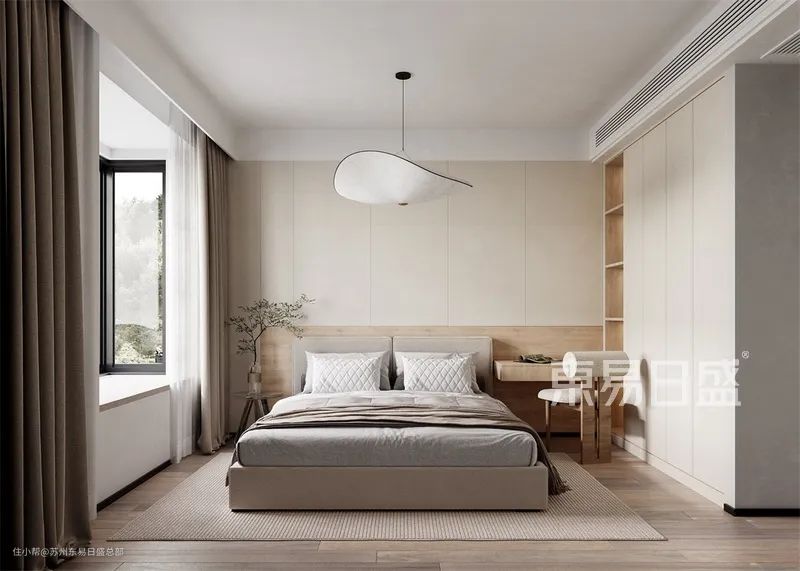 隐形白色衣柜与卧室原木内饰相得益彰,亚麻,羊毛绒,纯棉各种触感的材质充斥卧室,温暖满满的生活感。