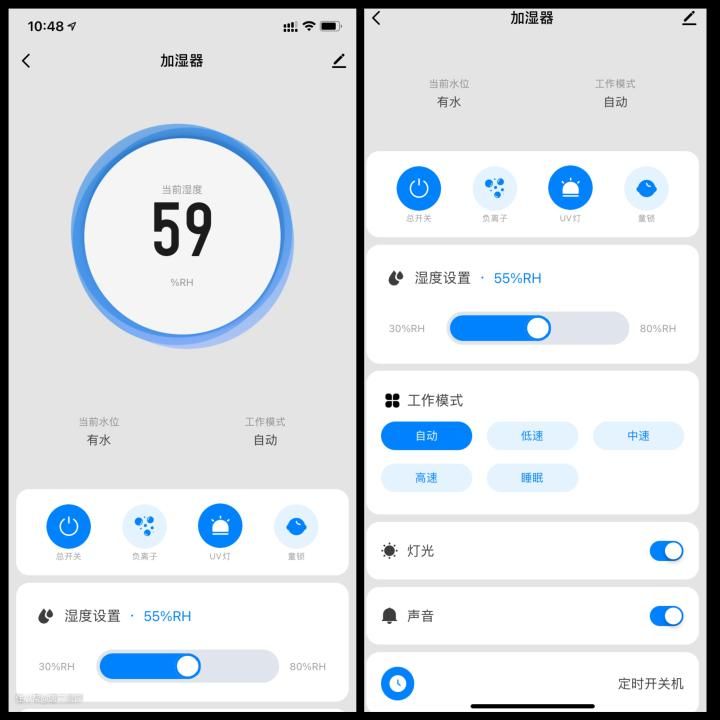 airx H8加湿器的APP中可以进行多种功能控制,负离子和UV杀菌灯也可以根据自己的需求开启或者关闭,当然我个人是建议全天开启的,还可以设置湿度、模式和风速。