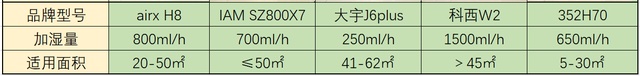 五款加湿器中科西W2的加湿量是最高的达到了1500ml/h,如果家里的房间面积真的特别大当然这款最合适。一般房间适中面积的话选择airx H8或者IAM SZ800X7这两款就完全可以了,加湿量刚好适合,不会过高或者过低,可以维持在一个非常舒服的状态。如果房间面积略小一点的可以选择352 H70也比较合适。大宇J6 plus的加湿量确实有点低,不过宿舍使用还是可以的。