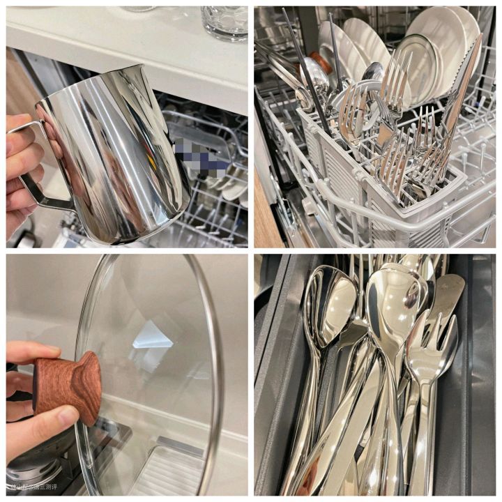 洗完之后的玻璃杯、碟子、不锈钢杯子、刀叉、玻璃锅盖,看起来亮晶晶的,这个效果我觉得太OK了,相比我自己放洗洁精,手洗的要干净太多了,也没有水垢的现象。而且完全解放双手。太香了!!!