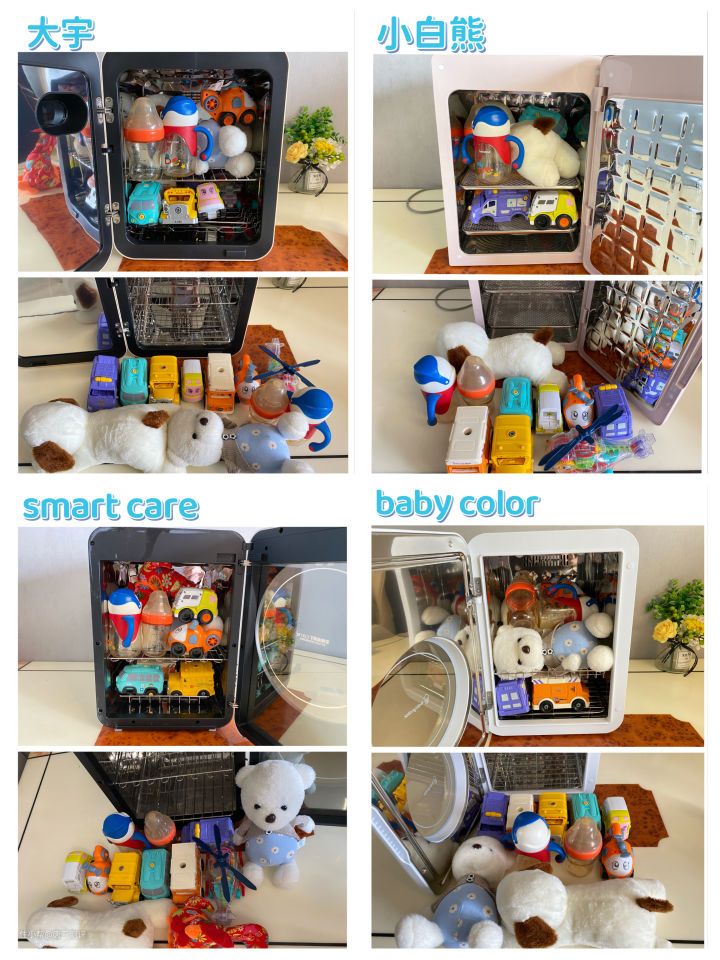 消毒柜不仅可以对宝宝的奶瓶、餐具进行消毒,还可以对玩具、衣服、毛绒玩具进行消毒,所以容量一定要选比较大的,四款中,除小白熊外,其余三款都是不错的选择。