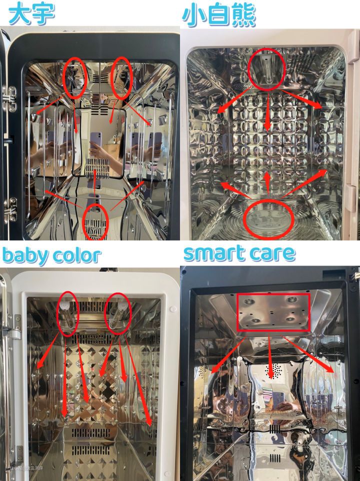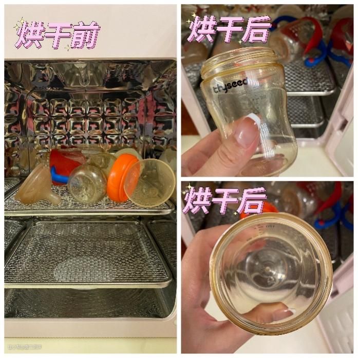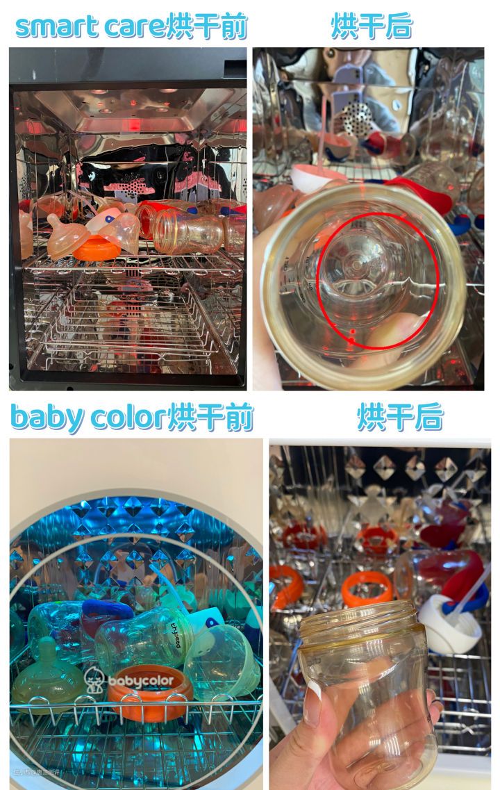 总结:通过烘干后的效果可以看出,大宇、babycolor、小白熊烘干测试下,都能烘干奶瓶,但唯一遗憾的是smarecare并没有我想象中的那么好,烘干后会残留的水迹。从烘干温度来看大宇 babycolor 、smartcare拿出来的时候都是比较温的不会烫手,大概是65摄氏度左右。则小白熊拿出来会一些烫手温度在70摄氏度左右。