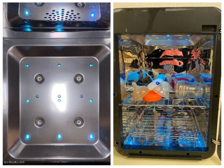 本款奶瓶消毒器采用顶部九颗灯珠的消毒方式,无汞杀菌,由于只有单层灯珠消毒,所以会有一定的消毒盲区照顾不到,杀菌效果自然时不如上下双层灯珠。
