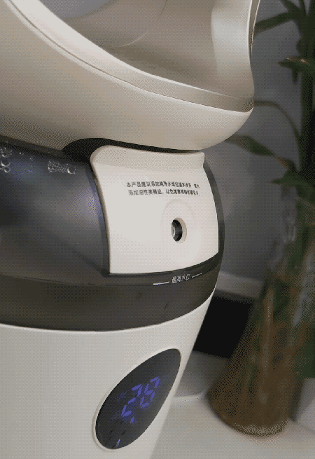 了解完它的底座,在往上看就是它的加湿功能了。它采用超声波震荡雾化设计,500ml的加湿盒可以支持16个小时持续加湿,加湿量达到了30ml/H±20%,可以散发除微米级的超细腻水蒸汽,可以平衡下空调房干燥的缺点,并且还是独立开关设计,避免了开机即加湿的烦恼,不用风扇的时候还能当做加湿器来用。