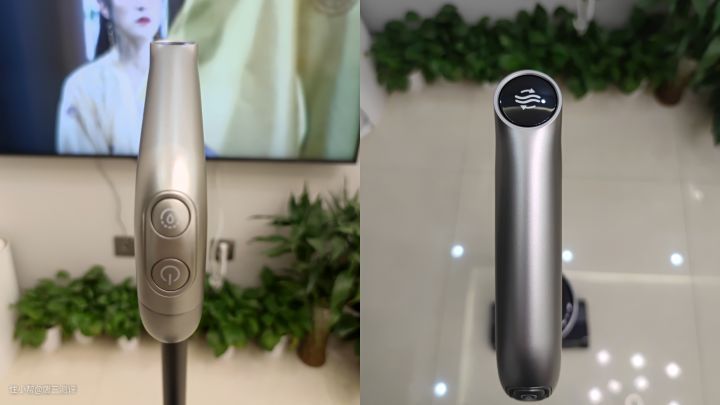 手柄顶部黑色按键是自清洁键,轻轻一按,他就会自己制备除菌液然后进行自清洁最后烘干。前面有两个按键,上面为模式切换,下面为开关键。