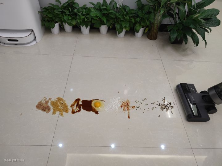 集瓜子皮、绿豆、番茄酱、沙拉酱、鸡蛋、生抽、耗油、泡面、八宝粥于一地。 干湿垃圾,液态固态垃圾都有,不用我多说,看完视频想必大家心里已经有了答案。 高速无刷电机不仅仅带来了超强的吸力,滚刷超高转速的组合,可以得到更强的擦地力,家里地面上的各种干湿垃圾都难不倒它。 对,总结就是一个字,牛!