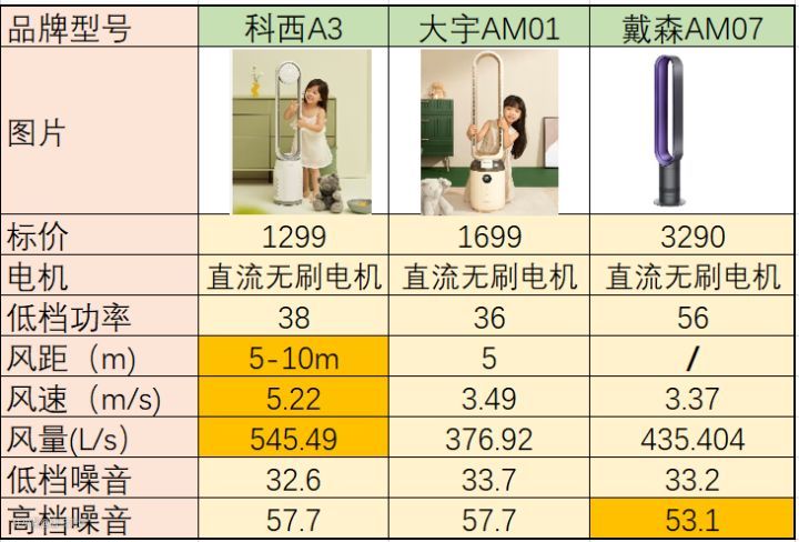 以上三款同是直流无刷电机的无叶风扇,科西的低档功率相较于大宇AM01还是差一点,但是在风距、风速、风量方面科西A3就比较优秀了,甚至领先戴森不少。