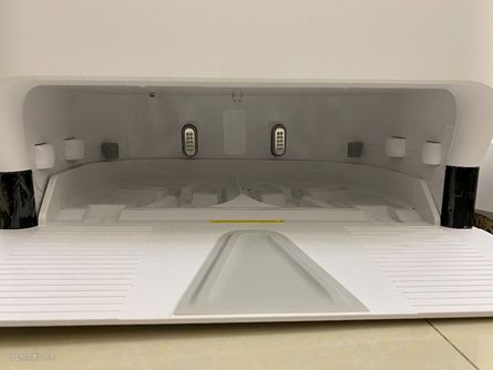 打开顶盖,我们就可以看到清水桶和污水桶,深色的污水桶和透明的清水桶,特别容易区分,还有带橡胶圈保护的进出水口,水桶容量很大,一次湿拖可达350平方,主机工作完成后返回基站可自动加水,水量供应充足,中途无需加水倒水,非常适合主人不在家时机器人独立清洁。