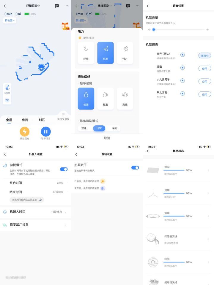 从手机端app我们可以了解到机器的电量,还有滤网、边刷、滚刷、抹布等耗材的状态。可以调节机器扫地、拖地、先扫后拖等模式,还可以调节吸力大小,拖布的湿度,这样不管是喜欢干拖还是湿拖的小主都可以满足。