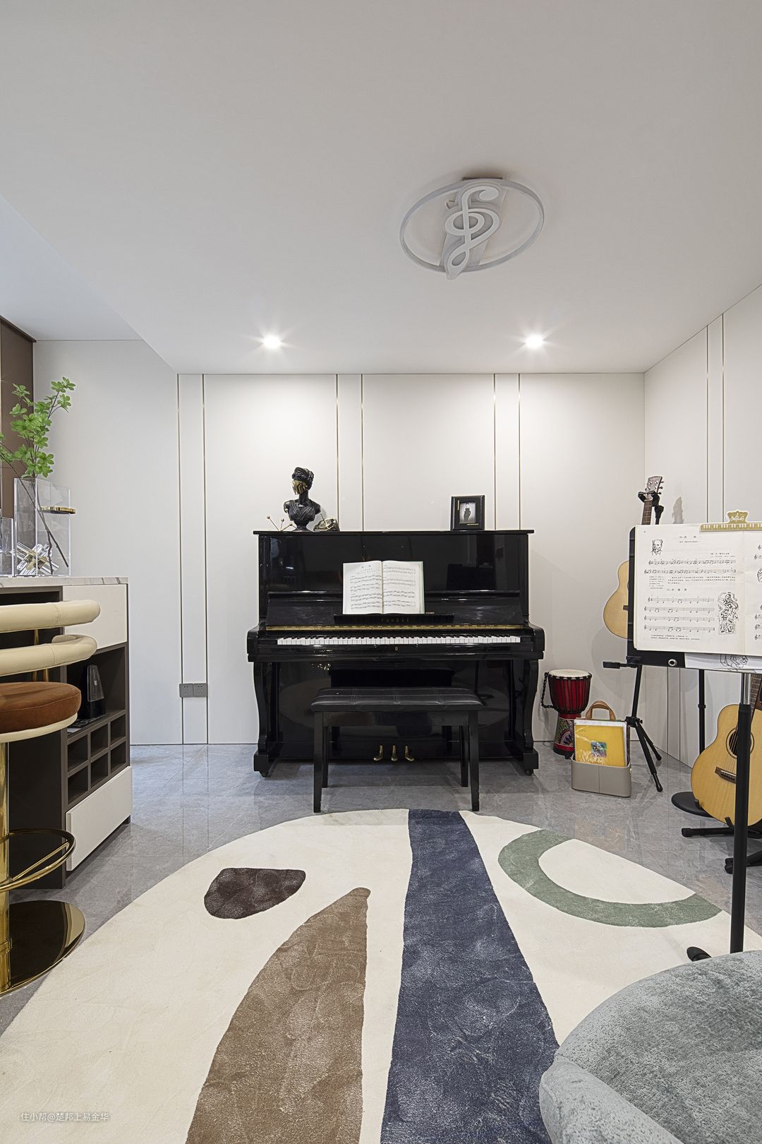 休闲区做了吧台式收纳柜,闲暇时可以坐在高脚凳上放松一下,主灯和无主灯设计结合,音符状的主灯,很符合休闲区的氛围。不规则的地毯,增加了客厅轻松,自在的氛围感。