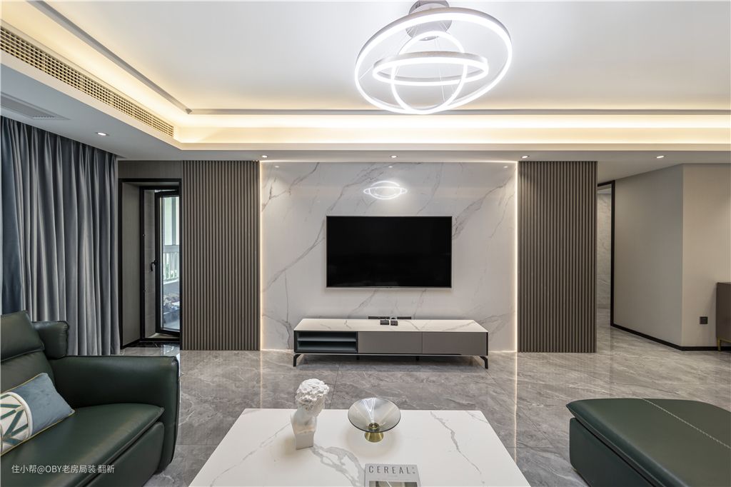 客厅电视墙是由三块800*2.3米的岩板拼接而成,相对大理石石材造价较低且施工工艺也比较简单,搭配两侧干净利落的木格栅线条和暗藏灯带的设计,给冰冷的居住注入一丝暖暖的气息。