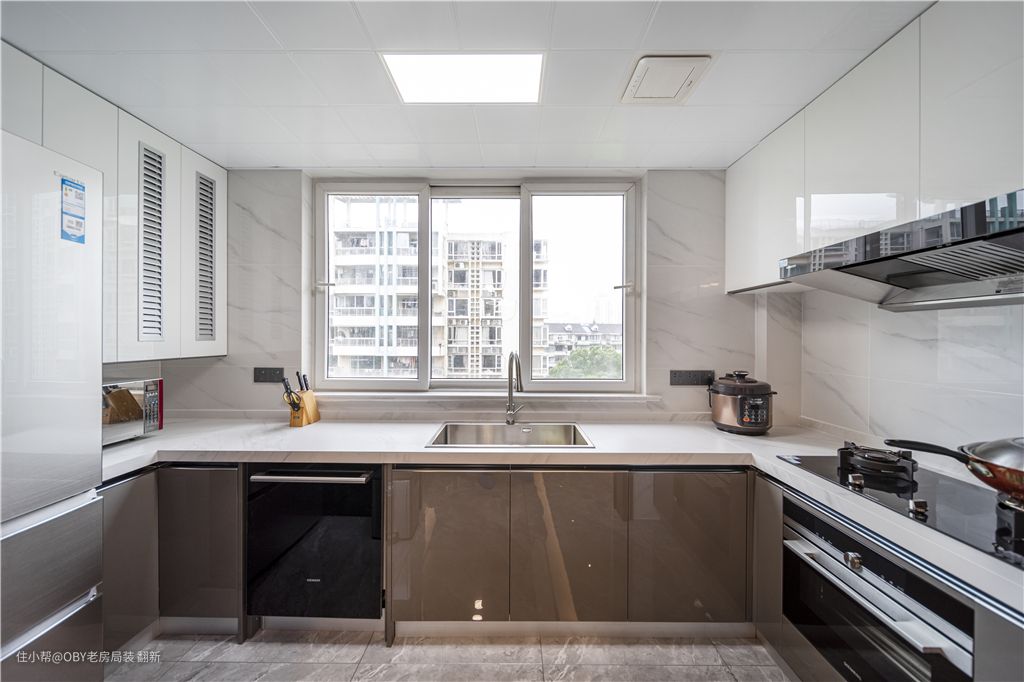 短U型厨房布局,使整个动线更高效,节约操作时间。 厨房设计嵌入式家电,将空间利用最大化。 白色与茶色亚克力门板,易于平时的清扫打理。