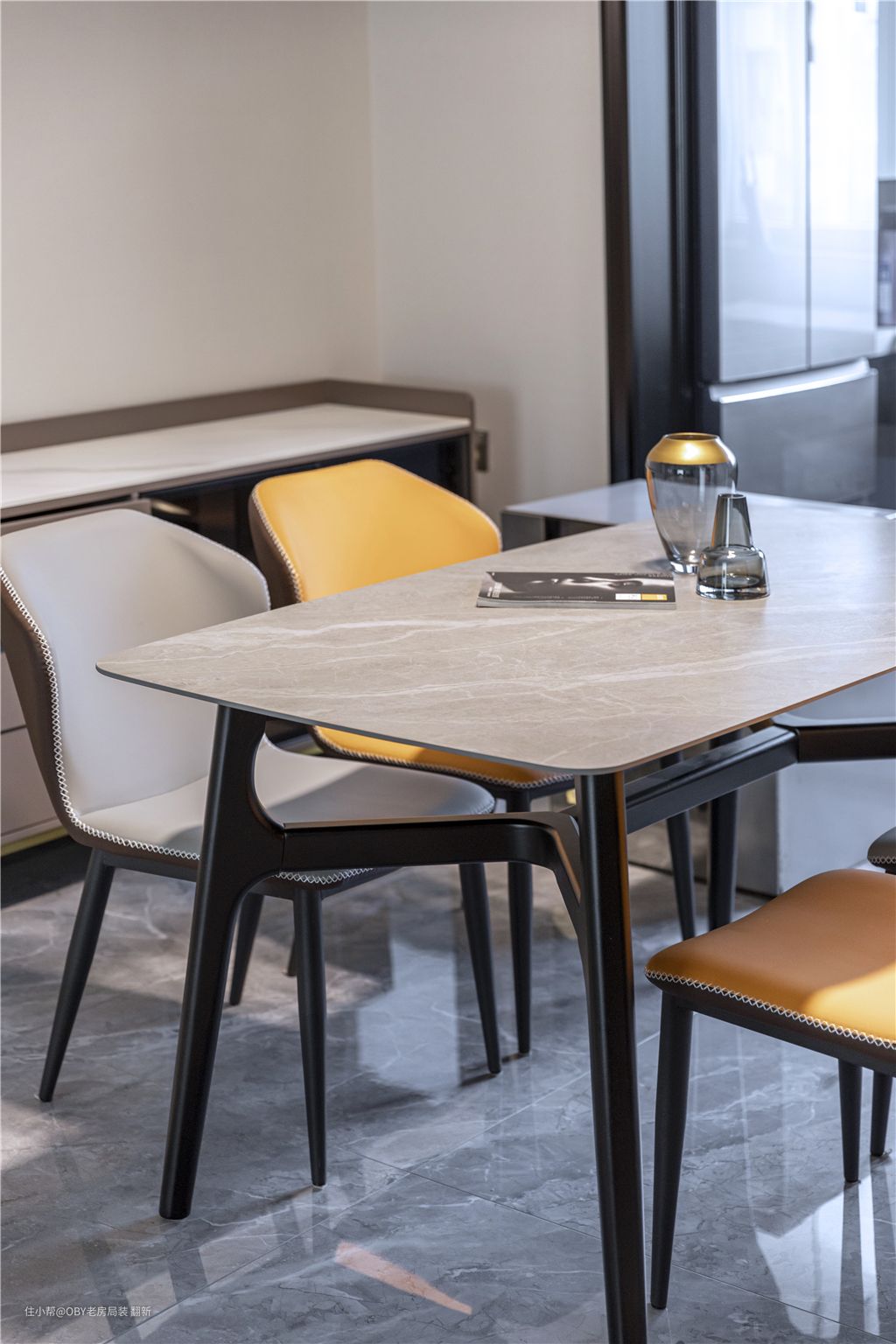 意式餐桌椅组合为居室营造出富有格调的用餐环境,同时选用姜黄色作为空间的点缀,与客厅抱枕相呼应,既没有柠檬黄那样刺眼,也没有土黄那般阴沉,似像水洗过一般,任由自然做旧,为居室增添一抹轻快、活力艺术色彩。