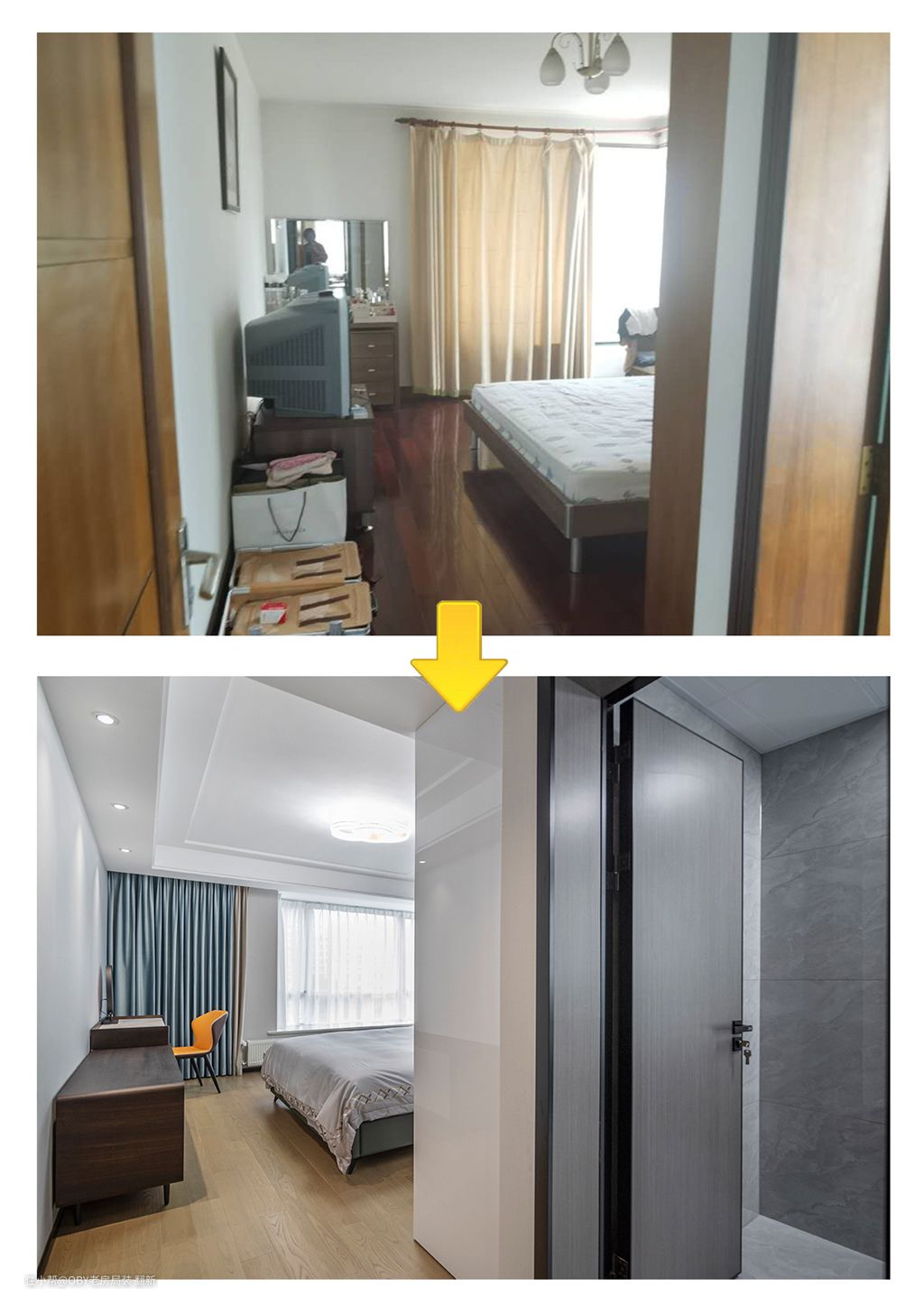 卧室前后对比图:保留原始布局,利用吊顶和色彩提升空间的明亮度,窗帘盒的设计使屋内自然光照射最大化。