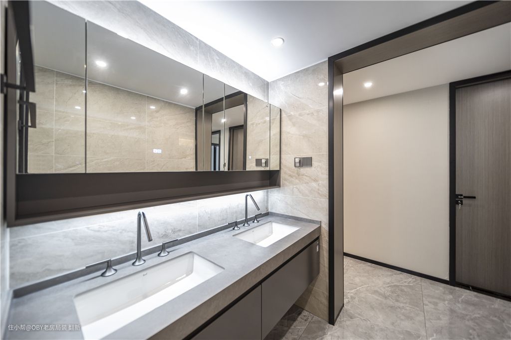 改造后的卫生间将门洞加宽10公分,增加空间的舒适性,双台盆的设计使干区空间锦上添花,宽敞的洗面台区域足够容纳两个台下盆,上下储物柜也让空间收纳有序,保持整洁。