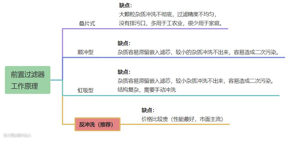 根据工作原理,前置过滤器分4种类型,目前市面上反冲洗类型的前置过滤器也是卖的最多的,至少占有七八成市场份额。建议只考虑【反冲洗类型】,其他的无需考虑。