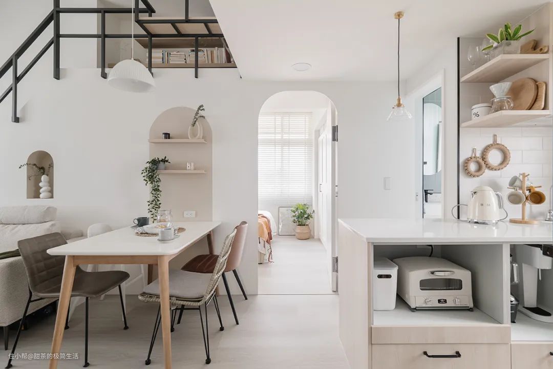 客厅和餐厅在同一个空间里,屋主把旁边的阳台也纳入进来的,再加上旁边的开放式厨房,显得公共空间开阔通透。