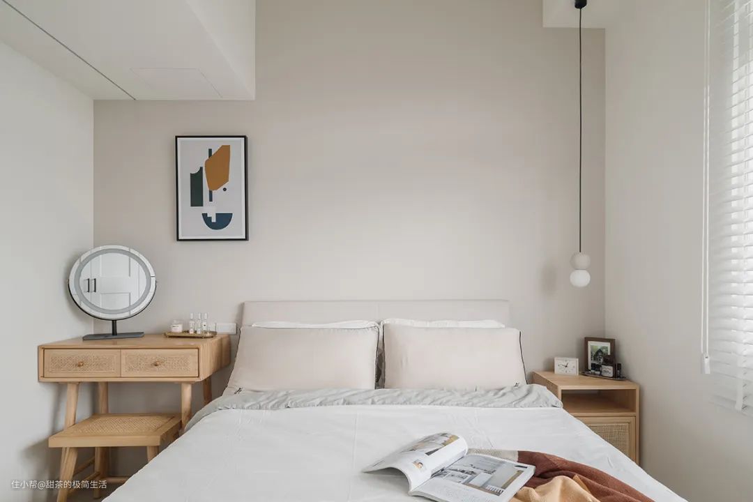 梳妆台、穿衣镜,统一规划在床的左侧,不仅丰富了主卧的功能性,异形穿衣镜也起到了装饰空间和放大空间感的作用。