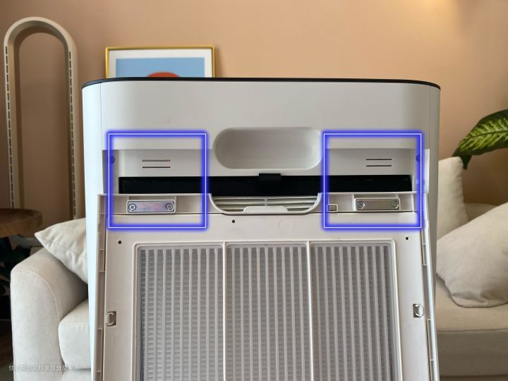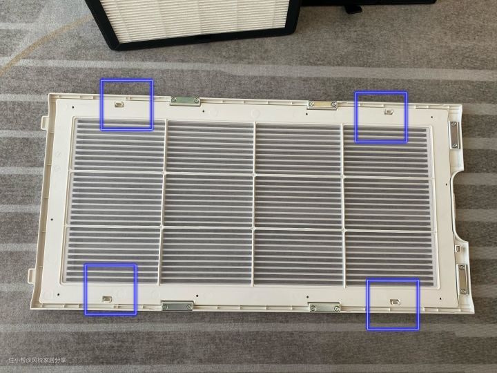 首先取下来的是M8 的初效滤网,初效滤网是利用四个卡扣固定在进风格栅上面的,主要用来过滤毛发、柳絮、头皮屑等大颗粒的杂质,可以进行水洗,晾干后可以继续使用。
