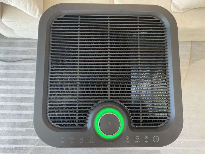 操控区有睡眠模式、定时、童锁、更换滤网提醒、UV、负离子、智能模式和开关键。中间圆型旋钮是用来调节风速的,外环一周的指示灯颜色可以反应空气质量,绿色为优、蓝色为良、黄色为中、红色为差。可操控性比较强,没有过于复杂的控制方式,各种模式在触摸后清晰显示,很好操作。家里的老人也能轻松驾驭。